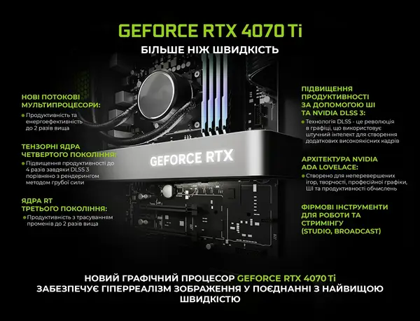 Потужна відеокарта GeForce RTX 4070 Ti з 12GB відеопам'яті надасть тобі неймовірні графічні можливості, роблячи ігри максимально реалістичними та яскравими.