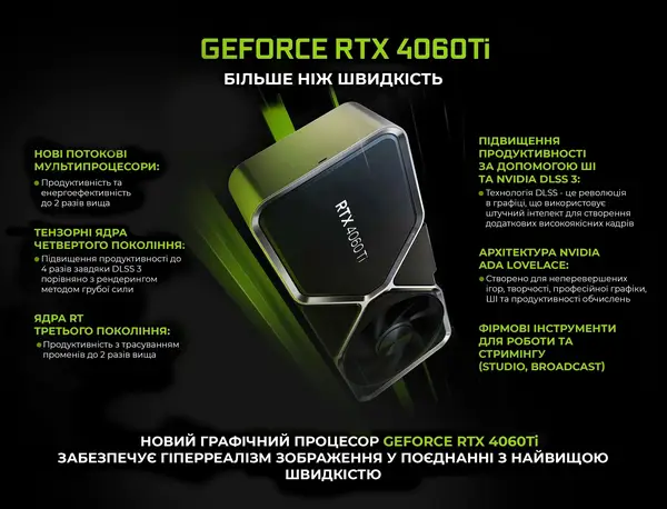 Однак особливу увагу слід приділити відеокарті GeForce RTX 4060 Ti із 8 ГБ пам'яті. Ця відеокарта забезпечує приголомшливу графічну якість і дозволяє запускати найсучасніші ігри на максимальних налаштуваннях. Ви зможете насолоджуватися дивовижними візуальними ефектами, плавними анімаціями та реалістичними деталями ігрового світу.