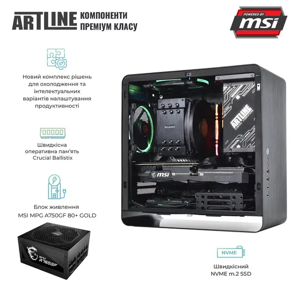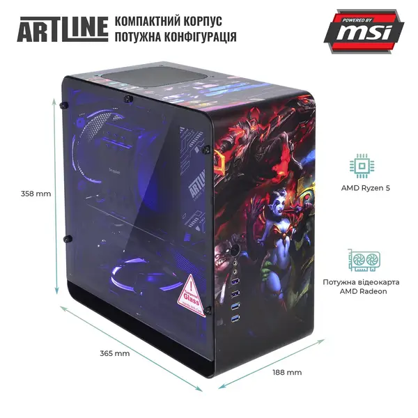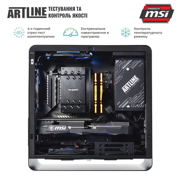 Усі компоненти ARTLINE DRAGONv38DH розміщені у стильному корпусі QUBE EAGLE з блоком живлення MSI на 750 Вт та комплектом вентиляторів. Алюмінієвий корпус з бічною панеллю із загартованого скла та унікальним дизайном не залишать байдужим жодного геймера.