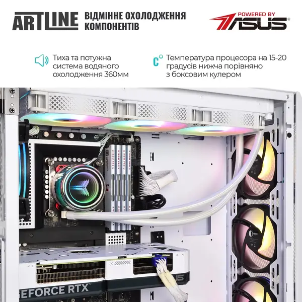 Комп'ютер також оснащений системою водяного охолодження процесора, що допомагає підтримувати низькі температури та забезпечує безперебійну роботу навіть за інтенсивних навантажень.