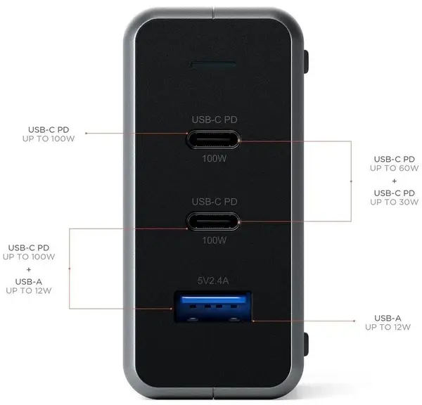 Завдяки додатковому порту USB-A зарядний пристрій GaN потужністю 100 Вт об'єднує кілька адаптерів живлення для одночасного заряджання до трьох USB-пристроїв. Його гнучкі виходи для зарядки виявляють і настроюють свої порти відповідно до різних комбінацій зарядки: 100 Вт, 100 Вт/12 Вт, 60 Вт/30 Вт, 12 Вт.